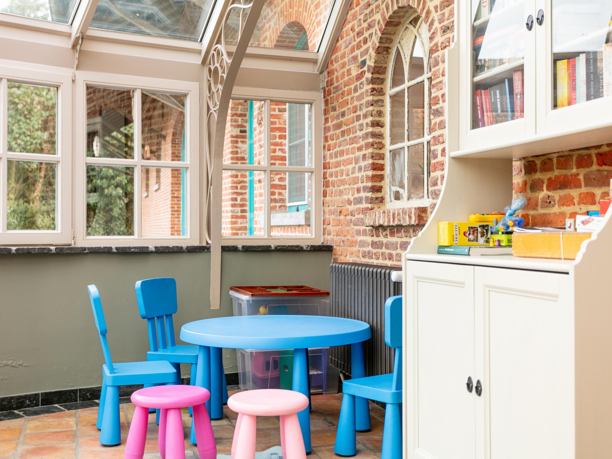 Begane grond: (eetkamer(eettafel(24 personen), kachel(hout)), keuken(waterkoker, broodrooster, fornuis(5 kookplaten, inductie), afzuigkap, koffiezetapparaat(filtermaling), 3x oven, afwasmachine, koelkast, 2x Staafmixer), open keuken(kookplaat(4 kookplaten, inductie), waterkoker, koffiezetapparaat(filtermaling), oven, afwasmachine, 2x koel-/vriescombinatie), woon/eetkamer(TV(smart TV)), toilet, serre(tafelvoetbal, speelgoed))