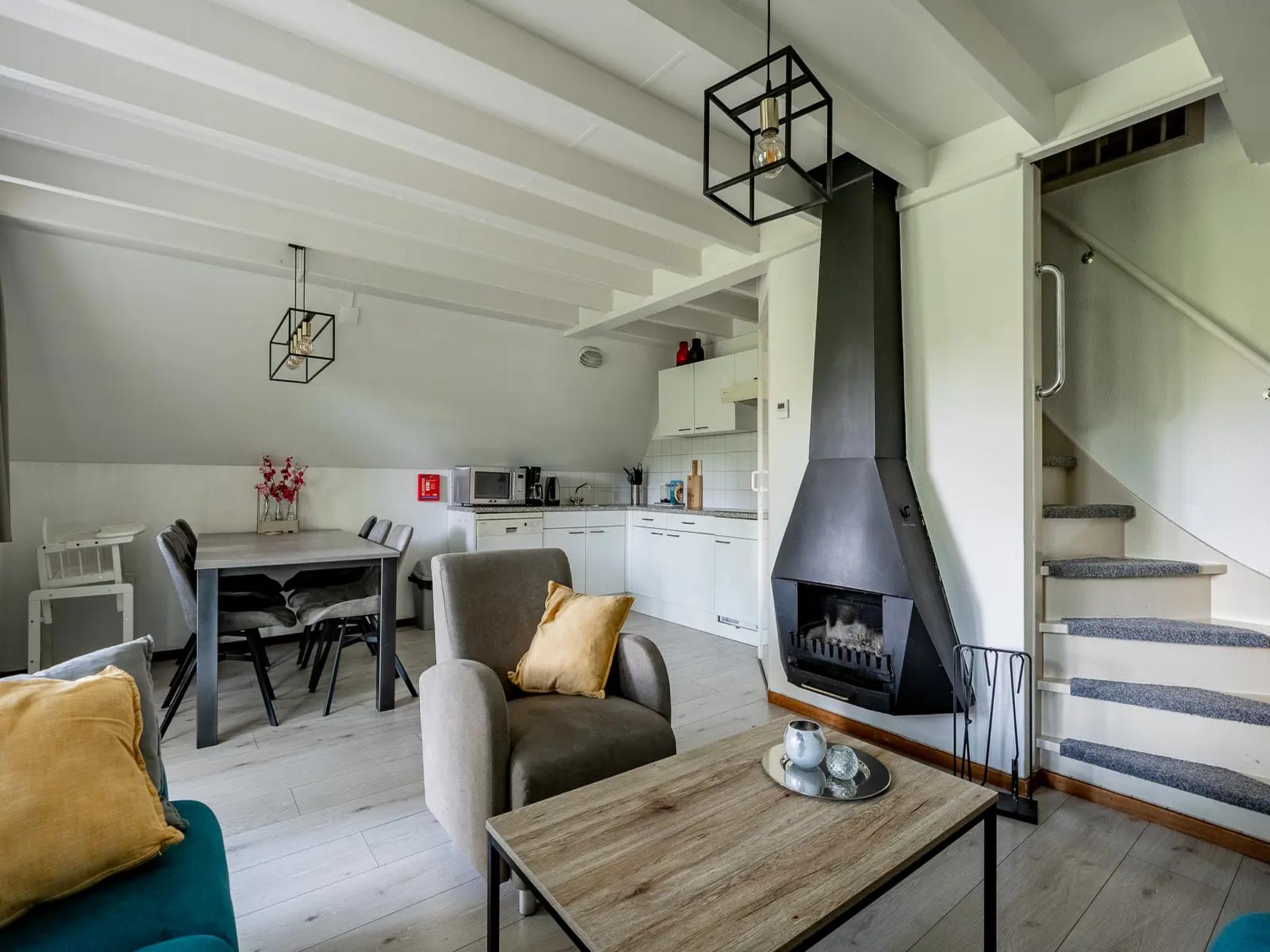 Begane grond: (hal, open keuken(kookplaat(4 kookplaten, elektrisch), waterkoker, afzuigkap, koffiezetapparaat(filtermaling), combimagnetron, afwasmachine, wasmachine), woon/eetkamer(TV(flatscreen, Nederlandse zender(s), Duitse zender(s), internationale zender(s)), eettafel(6 personen), open haard, zithoek), slaapkamer(2x 1-pers. bed(90 x 200 cm)), badkamer(douche(inloopdouche), wastafel, verwarming), toilet, berging(wasmachine))
