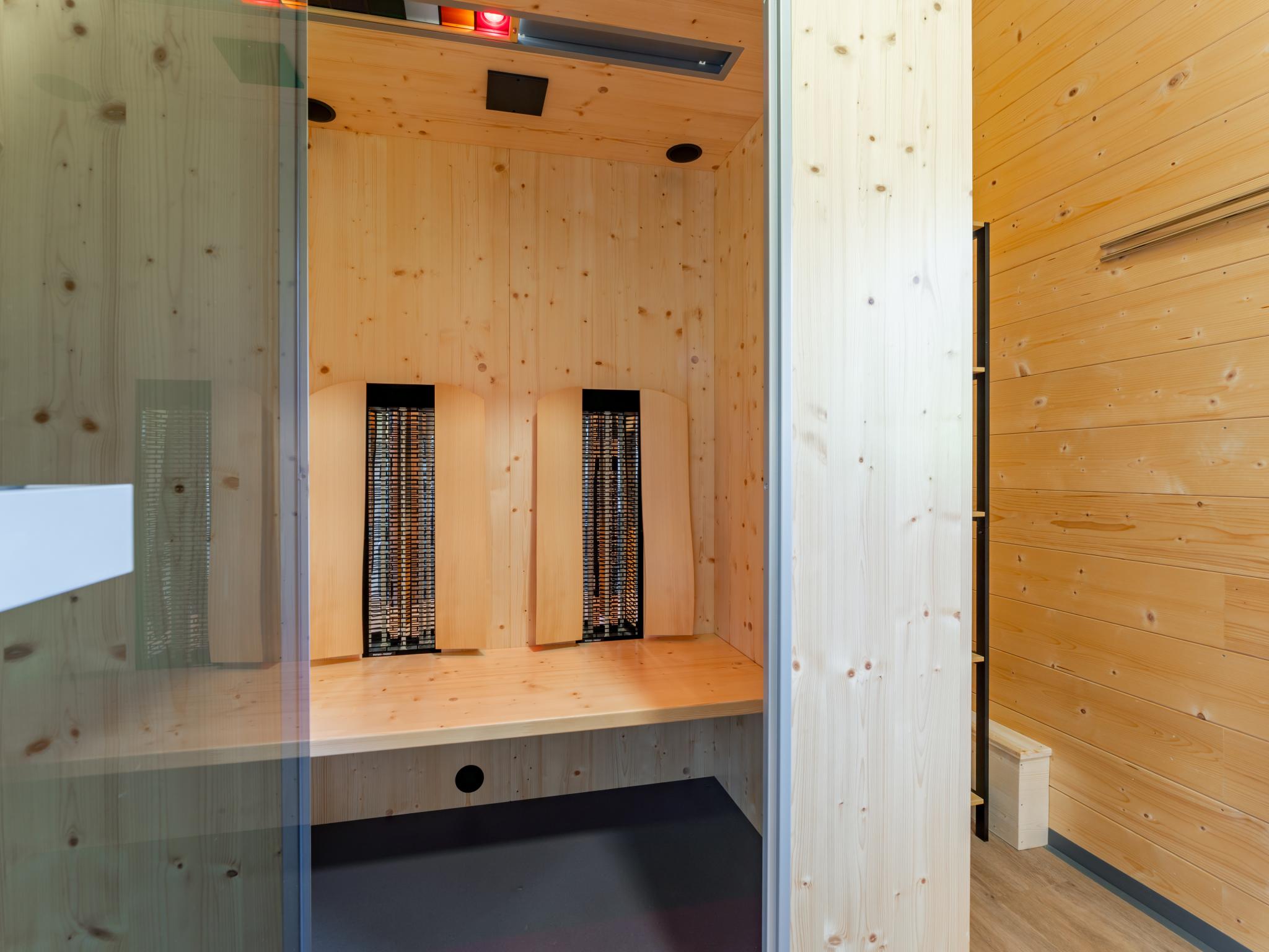 Op de 1e etage: (slaapkamer(2-pers. bed, TV), slaapkamer(2-pers. bed, TV), slaapkamer(2-pers. bed), badkamer(douche, infraroodsauna(2 personen), wastafel), 2x balkon)