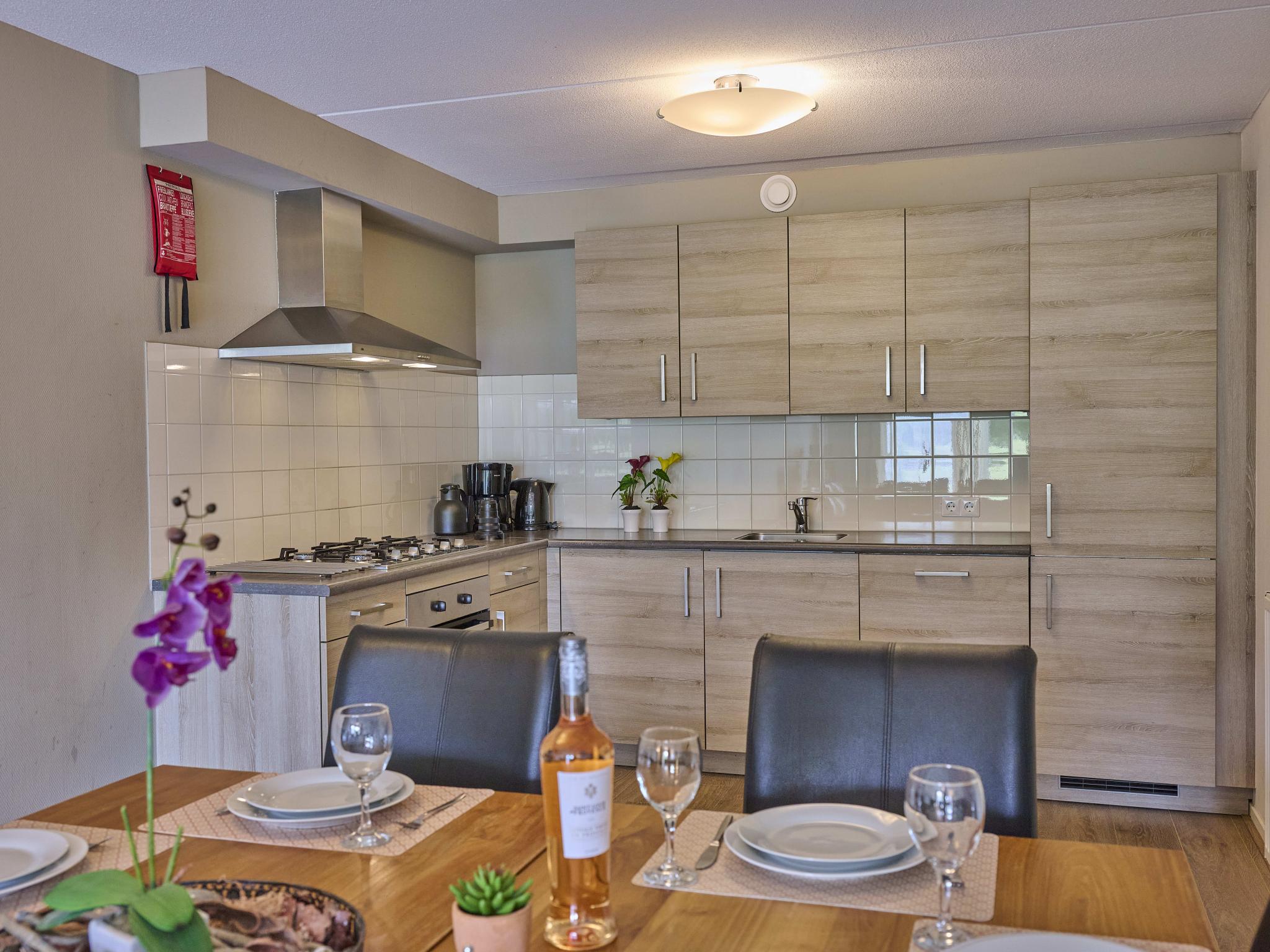 Begane grond: (hal, woonkamer(TV(flatscreen, Nederlandse zender(s), Duitse zender(s), internationale zender(s)), zithoek, DVD-speler, gezelschapsspellen), open keuken(eettafel(8 personen), waterkoker, afzuigkap, koffiezetapparaat(filtermaling), oven(elektrisch), afwasmachine, koelkast), slaapkamer(2-pers. bed(160 x 200 cm)), badkamer(ligbad, douche, wastafel, wc), toilet, terras, 1x kinderstoel)