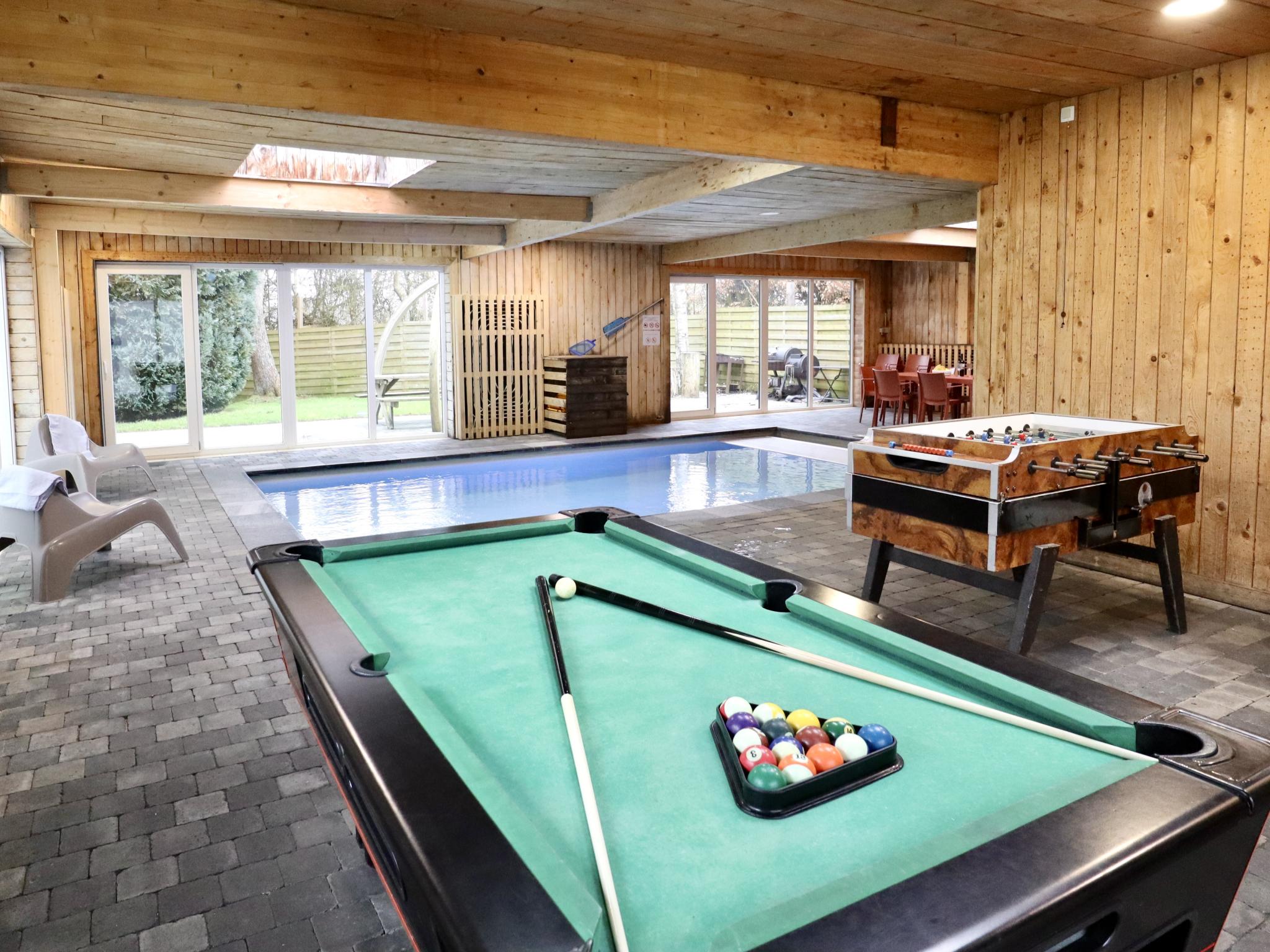 Begane grond(eigen entree): (zitkamer(TV), eetkamer(eettafel), open keuken(4x kookplaat(gas), waterkoker, koffiezetapparaat(filtermaling), koffiezetapparaat(senseo pads), oven(elektrisch), magnetron, afwasmachine, vriezer), slaapkamer met badkamer(2x 1-pers. bed(dekbed, 90 x 200 cm), wasbak, douche, wc), recreatieruimte(tafelvoetbal, biljart), relaxruimte(douche, sauna, wc), zwembad(privé, verwarmd, binnen, omheind, 8 x 4 m., diepte: 1.5m, Gehele jaar geopend))